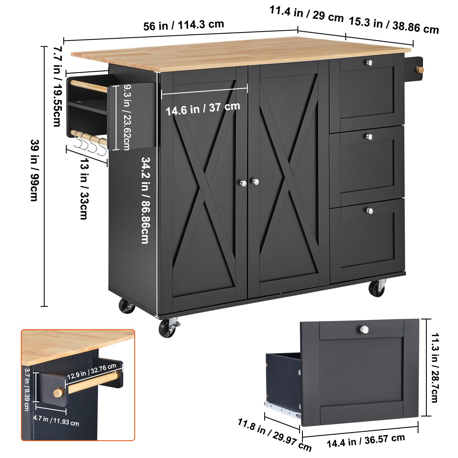 1.Premium Quality: The mobile kitchen island features a top made of high-quality solid rubberwood and MDF material, making the surface stain-resistant, waterproof, sturdy, and durable.