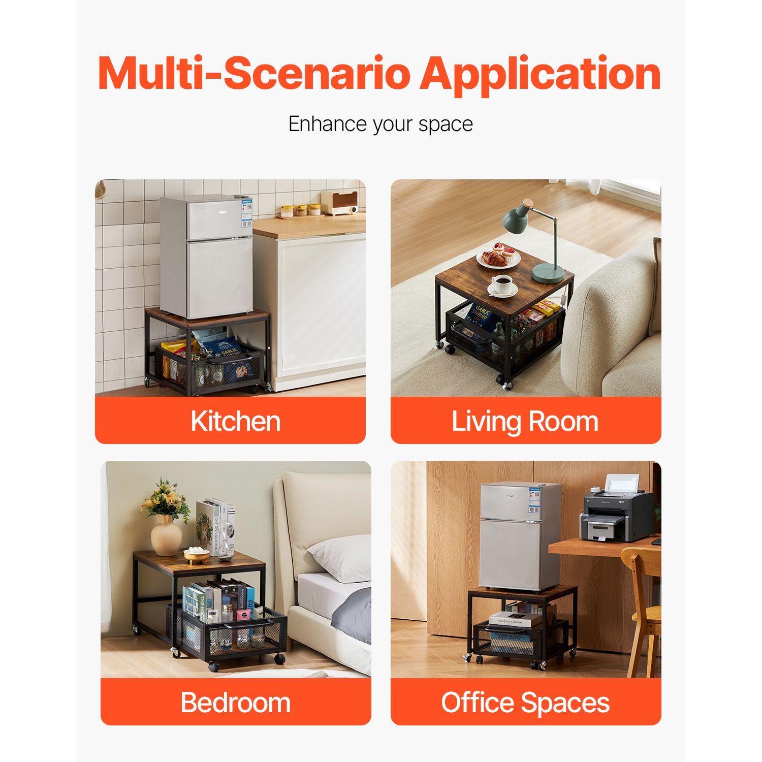 4.User-Friendly Design: The smooth, rounded corners of the tabletop ensure no sharp edges, preventing unnecessary scratches. The reinforced frame design keeps items from sliding off. This mini fridge cart raises your appliances off the floor, so you no longer have to bend down and your knees get a break.